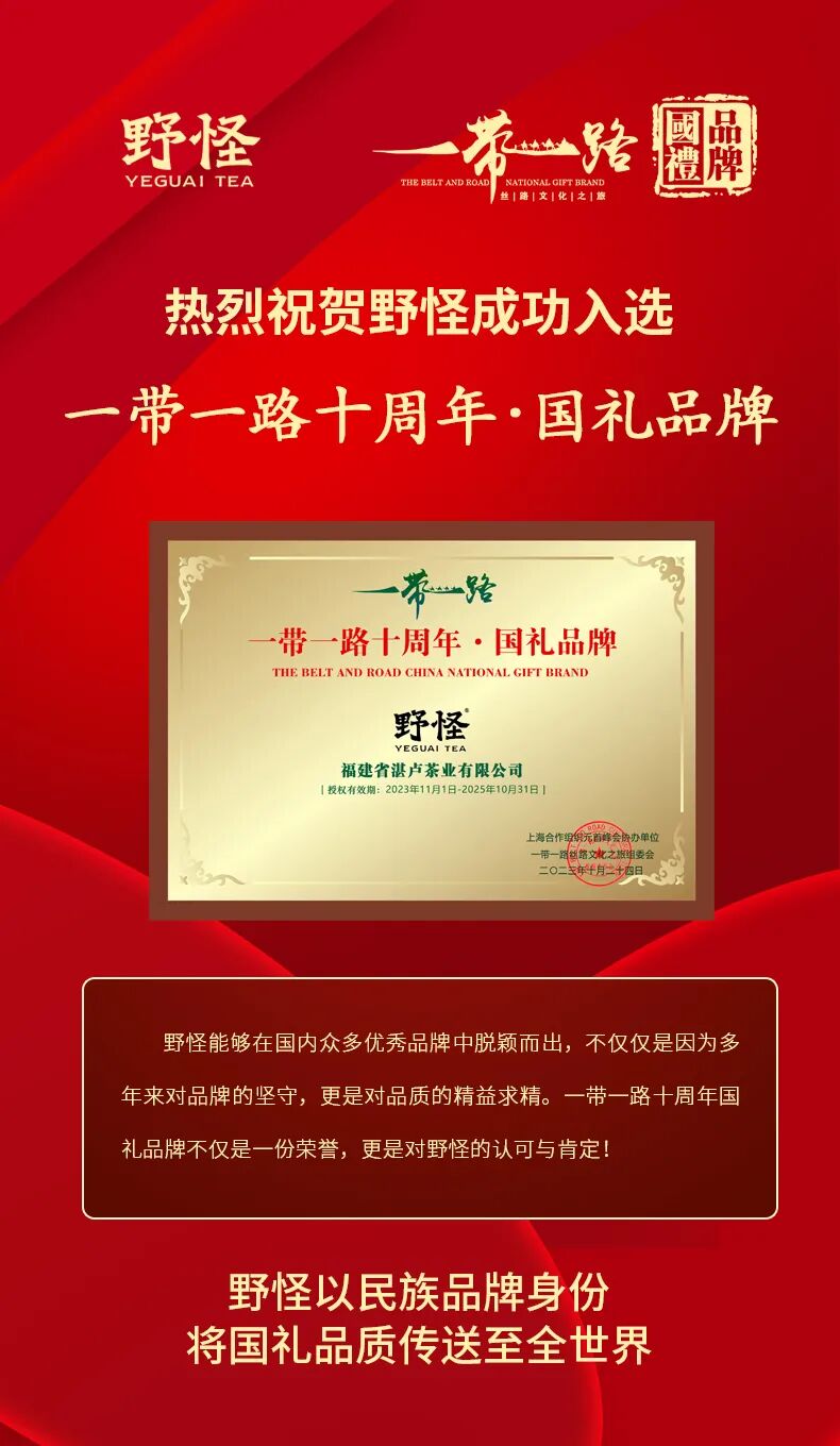 祝贺! “野怪”品牌入选“一带一路·国礼品牌”从丝绸之路到“一带一路”,中国走向世界市场的步伐从未停止。 十年发展、十年繁荣,“一带一路”的伟大战略,是承载时代使命的世纪工程,也是构建人类命运共同体的伟大实践。 △第三届“一带一路”国际合作高峰论坛开幕式现场 图片来源:央视新闻截图 2023年10月10日,为庆祝一带一路倡议提出并实施十周年,向世界推介展示中国优秀企业的品牌及产品。经一带一路沿线国家提议,由上海合作组织元首峰会协办单位——一带一路丝路文化之旅组委会与中亚国家联合推出“一带一路十周年·国礼品牌” 评选活动。 福建湛卢茶业有限公司及旗下品牌——“野怪”脱颖而出,成功入选“一带一路十周年•国礼品牌”。 “野怪”茶品牌将以民族优秀品牌的代表资格,将国礼品牌的高端品质传送至全世界。 深山藏野茗,稀奇有怪韵。“野怪”品牌生于松溪县湛卢山,自注册以来秉承“生态健康”理念,将山之韵味赋予茶之精魂,成就野怪茶的深山怪韵。 野怪产品涵盖红茶、绿茶、白茶、乌龙茶、茉莉花茶等几大茶系,其中特色的荒野红茶在国内市场中处于主导地位,磻稀白茶系列、武夷岩茶系列、有机茶系列及九龙大白茶系列也在市场中取得了不菲成绩。 值此“一带一路十周年” 活动,野怪品牌将依旧保持初心,以“专注生态,做中国好野茶”为使命,坚持健康养生之道,让世界看到“野怪茶”,打开中国生态野茶走向全世界的发展之路。 |