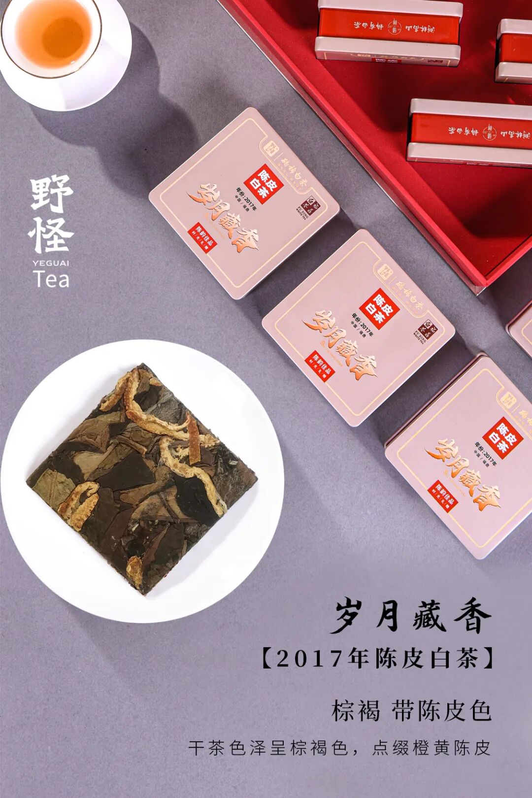 陈皮与老白茶的相遇,陈皮,入方能和百药,入膳能调百味。老白茶,越温和汤感越存越醇厚。双陈结合,诞生出奇妙新滋味,既有陈皮的芬芳又有白茶的清醇。这是一款有健脾养护的老茶,不止适合冬季品饮,更适合赠送给家中长辈。